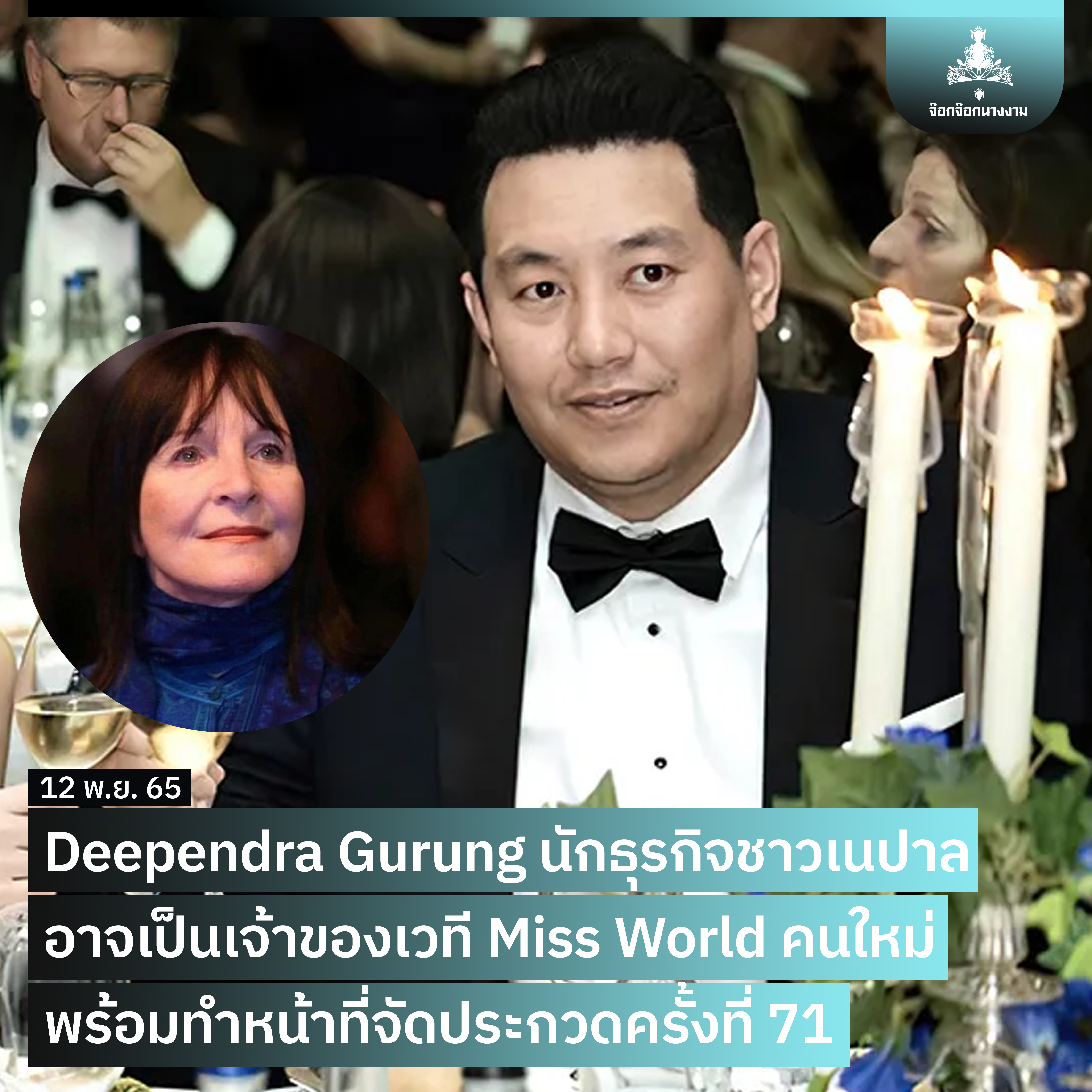 March 19, 2023แหล่งข่าวนางงามที่น่าเชื่อถืออย่าง PageantImpress เว็บไซต์การประกวดนางงามชื่อดัง ได้เปิดเผยว่า Deependra Gurung นักธุรกิจชาวเนปาล ที่อาศัยอยู่ในอังกฤษ ได้เข้าเทคโอเวอร์เวที Miss World ต่อจากป้าจู...