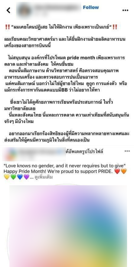 ไม่สนุบสนุน องค์กรที่โปรโหมด pride month เพียงเพราะการ ตลาด และทำตามสังคม ให้คนชื่นชม ตอนนั้นสัมภาษงาน ด้านวิทยาศาสตร์ คือตรวจสอบคุณภาพ อาหารบนเครื่อง และตรวจสอบการปนเปื้อนอาหาร แต่คนสัมภาษณ์ บอกว่าไม่ใช่ผู้ชายใช่ไหม ดูถูก การแต่งตัว หรือ แม้กระทั่งการทากันแดดแบบมีBB ว่าไม่อยากให้ทา