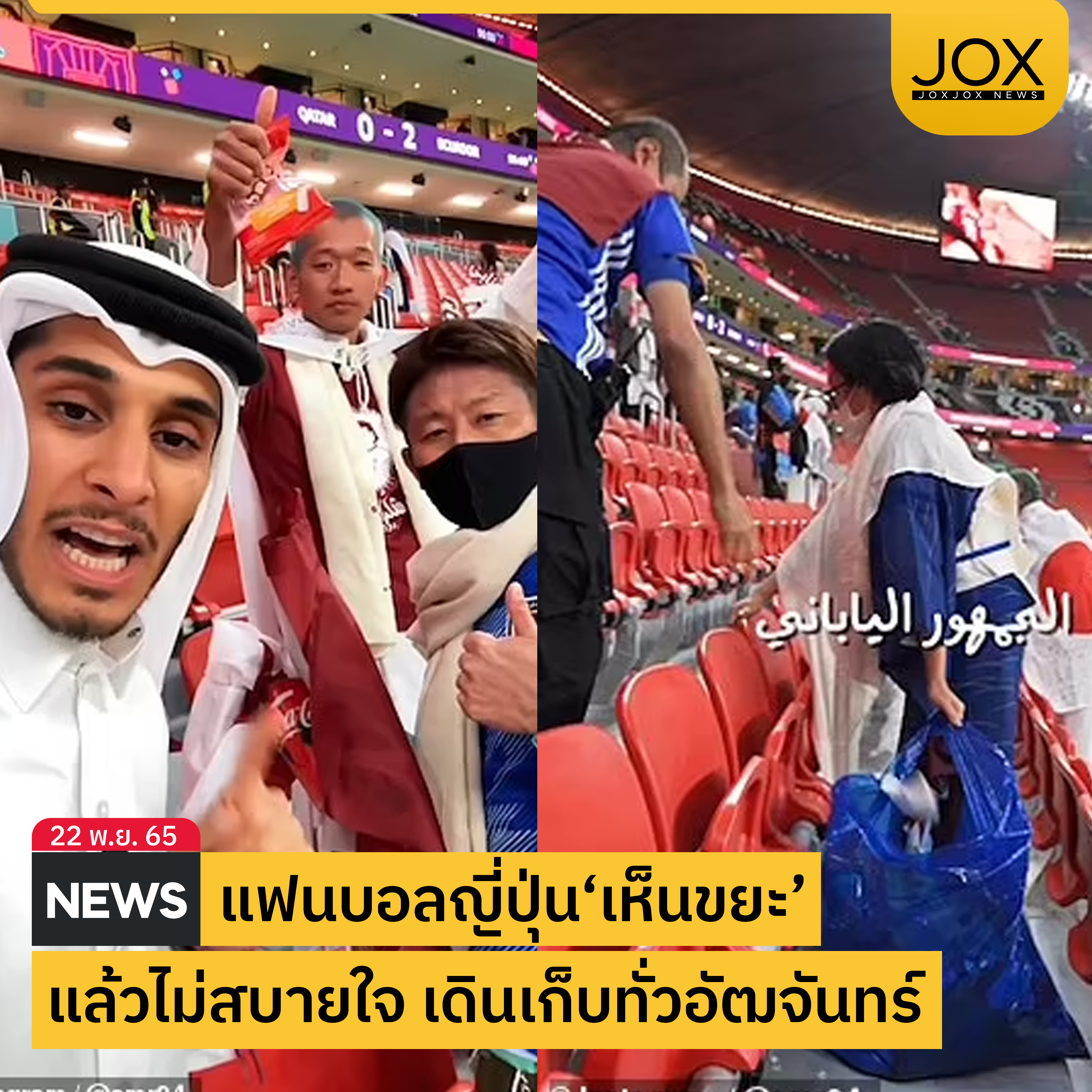 แฟนบอลเจ้าภาพกาตาร์ตะลึงเมื่อเห็นแฟนบอลชาวญี่ปุ่นเดินเก็บขยะทั่วอัฒจันทร์ในนัดกาตาร์เจอเอกวาดอร์ ซึ่งหลังจากที่แฟนบอลหลายคนเดินออกจากสนามหมดแล้ว แต่ยังมีแฟนบอลบางกลุ่มที่ยังไม่ออกจากสนาม เดินเก็บขยะอยู่ เจ้าของคลิปจึงเดินเข้าไปสอบถามว่าทำไมถึงได้เดินเก็บขยะแบบนี้ ซึ่งชาวญี่ปุ่นในคลิปก็ตอบกลับว่า ‘เราไม่สบายใจที่เห็นขยะทิ้งเกลื่อนอยู่แบบนี้ พวกเราชาวญี่ปุ่น เราให้เกียรติสถานที่’ หลังจากฟังคำตอบก็สร้างความประทับใจให้กับพ่อหนุ่มเจ้าของคลิปซึ่งเป็นชาวกาตาร์ด้วยนั่นเอง ที่มา Dailymail